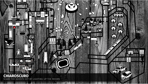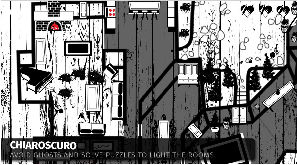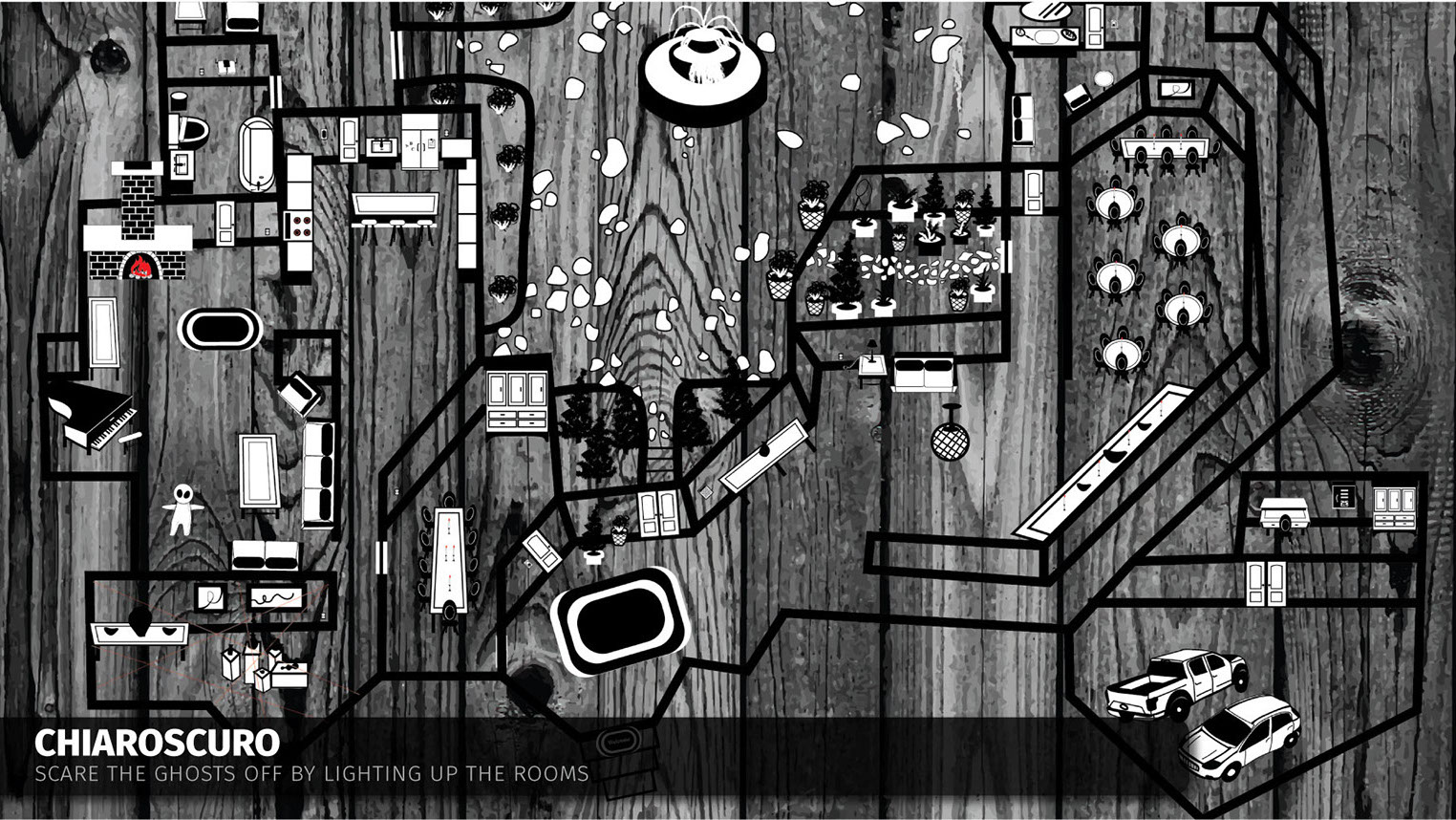 You are locked in a mansion with spirits that hide in the darkness. Your goal is to turn on all of the lights so that the spirits do not have any place to hide. Each room will have a different set of tasks that will have to be completed in a specific order to accomplish the end goal of light. For example, if a room has a fireplace you will have to chop wood and place it in the fireplace, then find a source to light the fire.